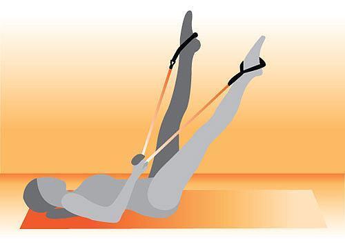 - Colocar uma faixa elástica em cada pé e segurar com as mãos colocando-as no centro de seu ventre.