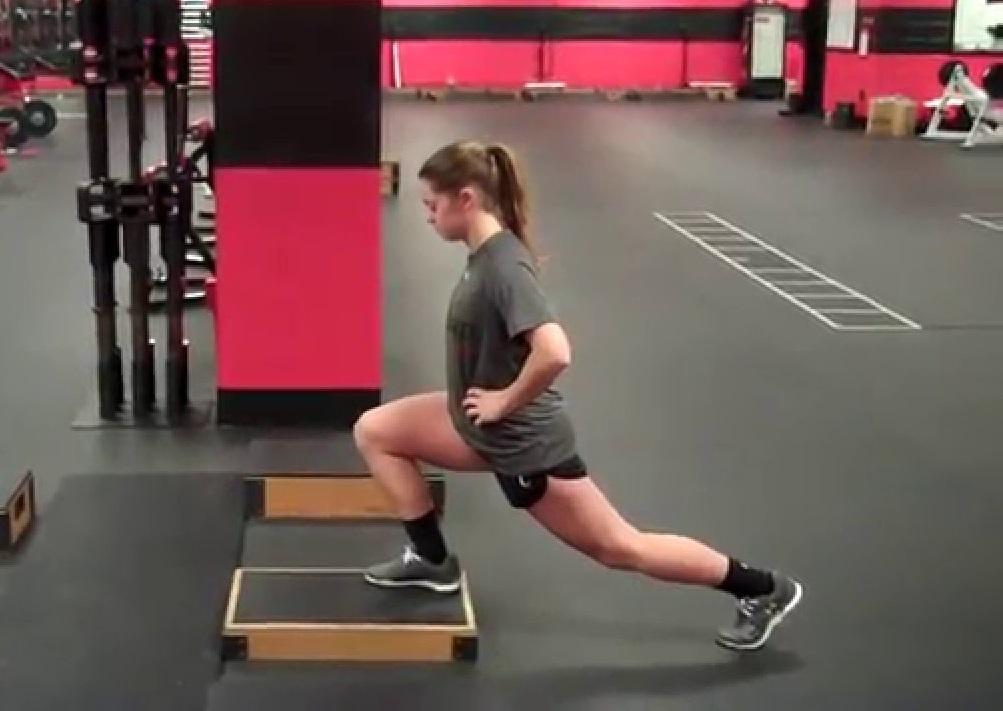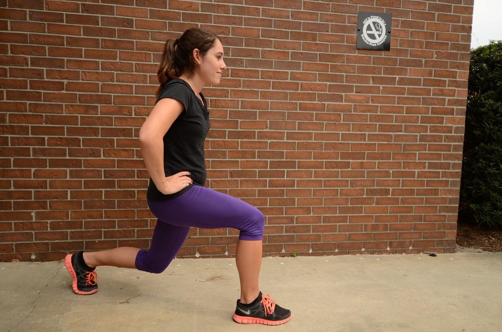 Flexione o joelho e desça lentamente até que a articulação da perna avançada forme um ângulo de 90 º. A perna de trás deve formar um ângulo de 80 º, aproximadamente. O peso do corpo deve ser colocado na perna da frente e as costas devem ficar eretas, assim como o torso.