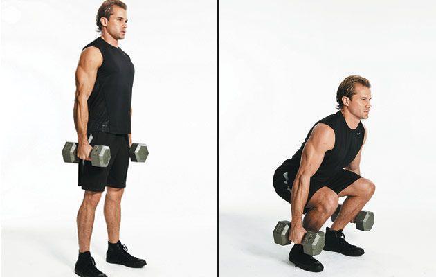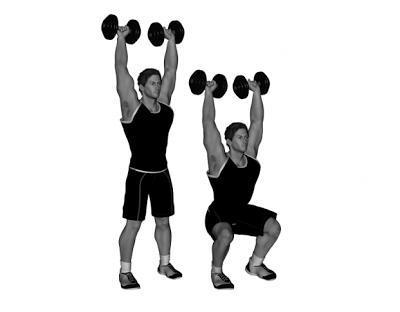 Suba o haltere sobre a sua cabeça e baixe como se fosse fazer um agachamento normal. Parece fácil, mas não é e pode ser feito mais fácil ou mais difícil segurando o haltere com as duas mãos, uma mão ou com um haltere em cada mão.
