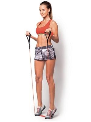 A panturrilha, ou gémeos, é a parte de trás da parte inferior da perna (abaixo do joelho). Fortaleça-a com o seguinte exercício: se coloque de pé, com os pés ligeiramente afastados e costas direitas, pisando o elástico; segure o elástico com as mãos, pernas encostadas ao tronco e cotovelos fletidos em ângulo de 90º; puxe o elástico movimentando seus pulsos na direção do ombro e, ao mesmo tempo, ficando em ponta dos pés. Volte à posição inicial e repita 10 vezes por 3 séries.