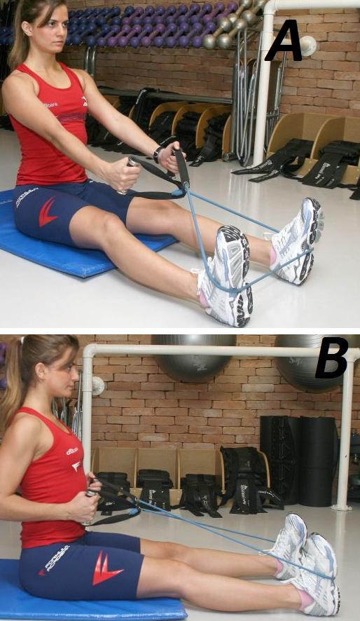 Se sente no chão com as pernas juntas e esticadas para a frente, passe o elástico pela sola dos pés e cruze-o na frente, segure o elástico com as mãos viradas uma para a outra e endireite as costas (A); essa é a posição inicial e o exercício consiste em puxar o elástico, fletindo os cotovelos, até encostar os pulsos à cintura, e mantendo as pernas e as costas eretas (B). Repita 10 vezes em 2 séries.