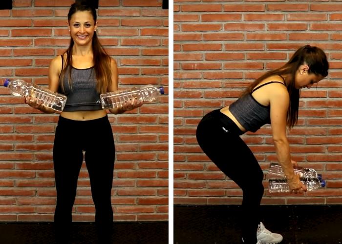 Fazer um peso é muito fácil com uma garrafa de plástico. Você só precisa enchê-la com dois litros de água. Recomendamos a você que as garrafas tenham um agarrador, assim será mais fácil pegá-las. Agora é só estabelecer uma rotina e levantar a garrafa cheia.