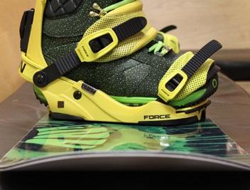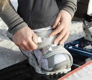 O fixador deve prender o entorno da bota e esta deve estar apertada no prendedor com as travas, tal como é mostrado na imagem. Deve haver uma trava que passa pela parte de cima do pé prendendo o calcanhar, e outra que fica presa sobre os dedos do pé.