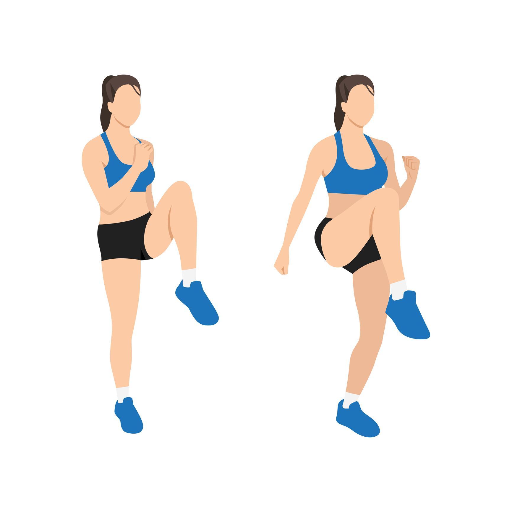 - A partir desta posição, levante uma perna com o joelho dobrado. Levante até a coxa ficar paralela ao chão. Mantenha a posição por alguns segundos, abaixe a perna e repita com o lado oposto.