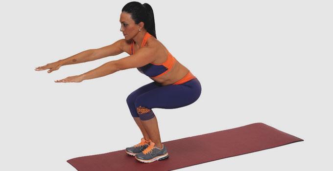 Quando já estiver bem colocado, agache lentamente tudo o que puder, sem mudar a posição dos pés, e depois volte à postura inicial. Faça 2 séries de dez repetições cada uma.
