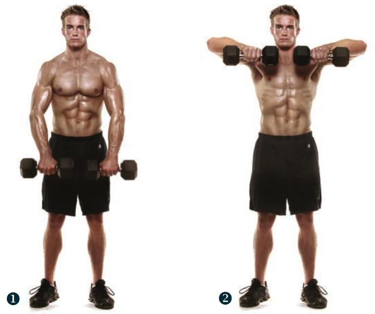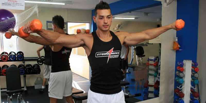 A elevação de ombros com halteres aproveita alguns elementos do exercício anterior. Para realizar a atividade, mantenha-se em pé, com os pés paralelos e os braços abaixados e colados ao corpo. Segurando os halteres, levante os braços na lateral de forma que eles permaneçam esticados. Eleve os braços até se alinharem com o ombro e depois abaixe-os, retornando à posição inicial. O exercício trabalha a musculatura do trapézio e fortalece também os ombros. Repita o procedimento ao menos cinco vezes.